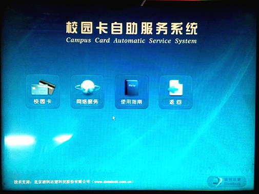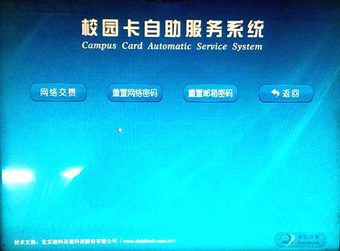 在校园卡自助服务机上(图1),用手点击屏幕上的“网络服务”按钮进入校园网络计费自助服务系统(图2 ),“网络交费”、“重置网络密码”、 “重置邮箱密码”和“返回”四个选项。