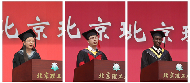 化学与化工学院2018届本科生陈凡、宇航学院2018届博士研究生魏昕林、计算机学院2018届本科生尼日利亚籍留学生阿米努3名同学代表全体毕业生感恩母校和老师们的悉心培育。他们分享了自己在北理工的学习生涯,特别是与老师和同学们一起潜心求知、大胆创新、勤于实践的难忘经历和丰硕成果,回顾了北理工“团结、勤奋、求实、创新”的优良校风和“实事求是、不自以为是”的严谨学风对自己求学、择业和人生发展的深刻影响,代表毕业生表达了对母校的感谢和祝福,并向母校作出承诺,将继承北理人的使命和荣光,担复兴大任,做时代新人,努力成长为“胸怀壮志、明德精工、创新包容、时代担当”的领军领导人才。