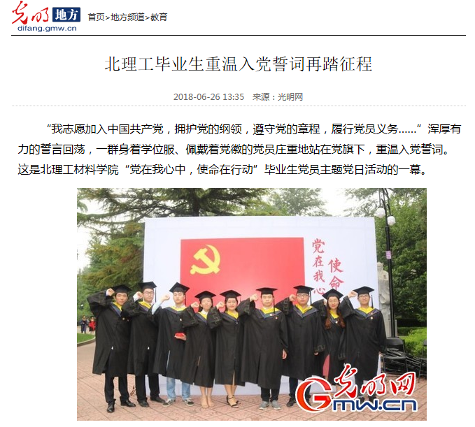 “我志愿加入中国共产党,拥护党的纲领,遵守党的章程,履行党员义务……”浑厚有力的誓言回荡,一群身着学位服、佩戴着党徽的党员庄重地站在党旗下,重温入党誓词。这是北理工材料学院“党在我心中,使命在行动”毕业生党员主题党日活动的一幕。